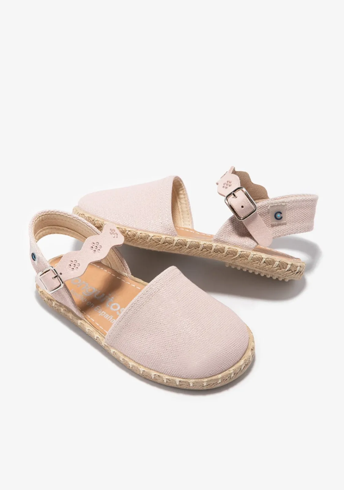 Alpargatas rosas con detalles en strass. Tiene la parte frontal cerrada y de tela rosa. Su cierre es de pulsera rosa con hebilla para una mayor sujeción al pie y está decorada con flores de brillos.