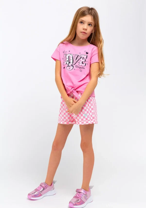 Nueva camiseta de manga corta de niña en color rosa con anudado frontal. Estampado de la palabra Love. Perfecta para que las niñas vayan monas y fresquitas este verano.