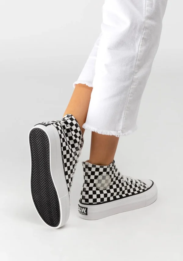 Zapatillas deportivas unisex con estampado de cuadros blancos y negros. Estas sneakers tienen la suela y la puntera de goma reforzadas, asegurando la comodidad en cada pisada, que además cuenta con algunos detalles en negro como el logo de Break&Walk. Unas deportivas perfectas para esta primavera-verano. Ideales para combinar con cualquier look.